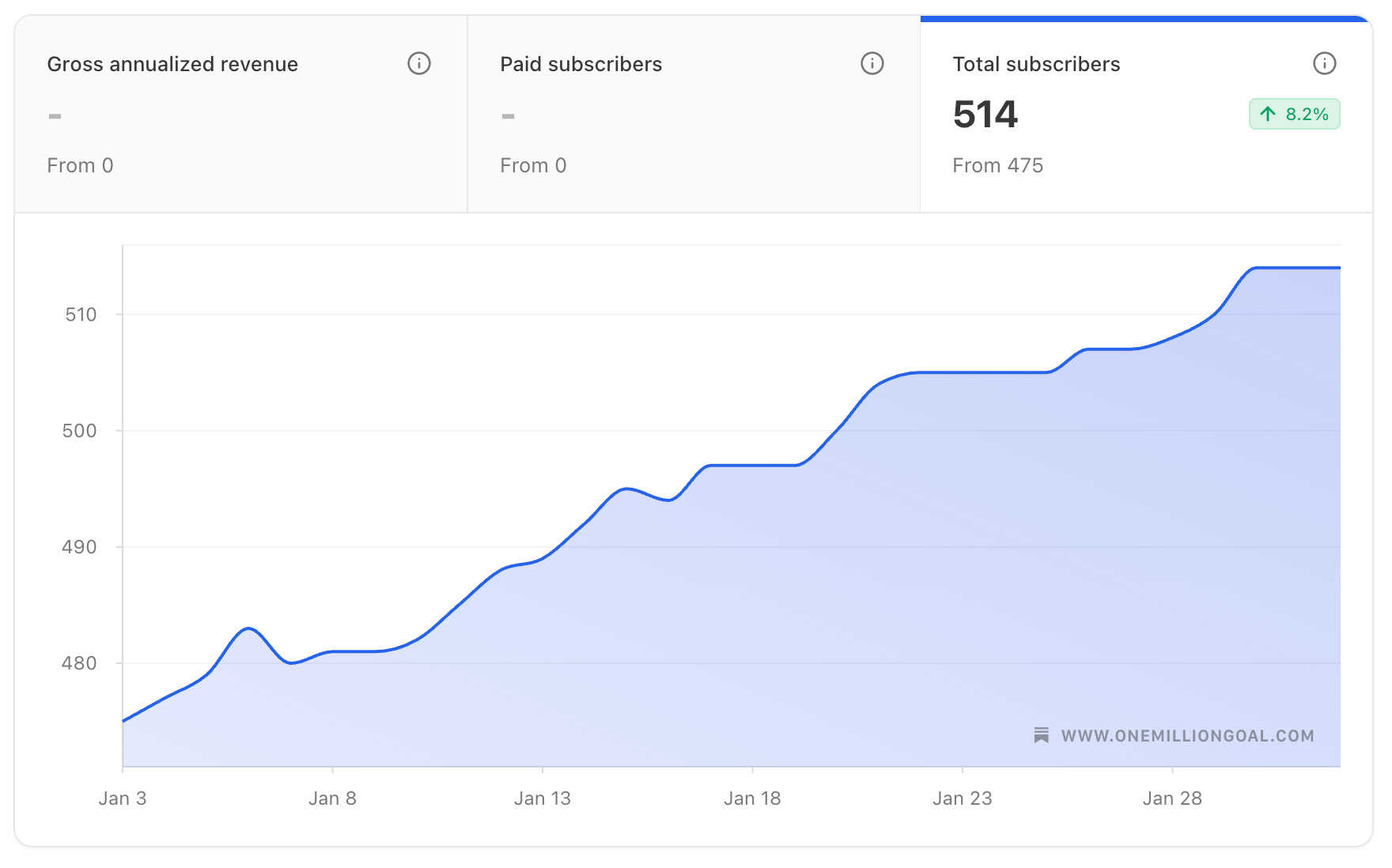 One Million Goal reached 514 subscribers (+39 since December).