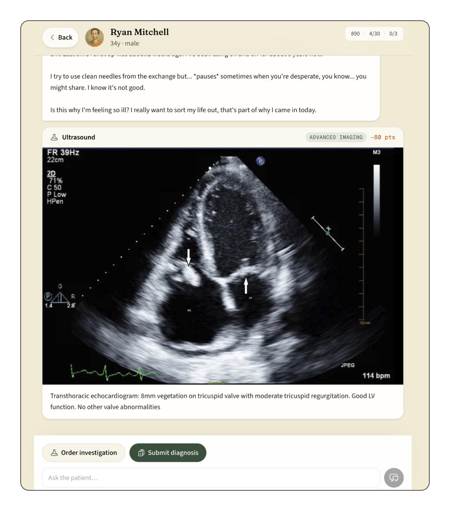 When you think you have enough from the conversation, you can order investigations. Physical exams. Blood tests. ECGs. Imaging. Biopsies. Each investigation has a point cost, because in the real world, ordering every test under the sun isn’t good medicine. It’s lazy medicine.