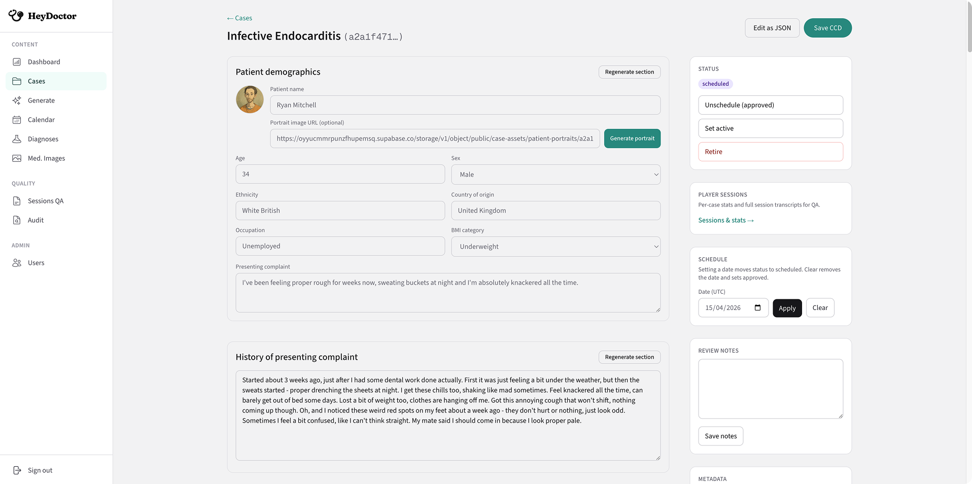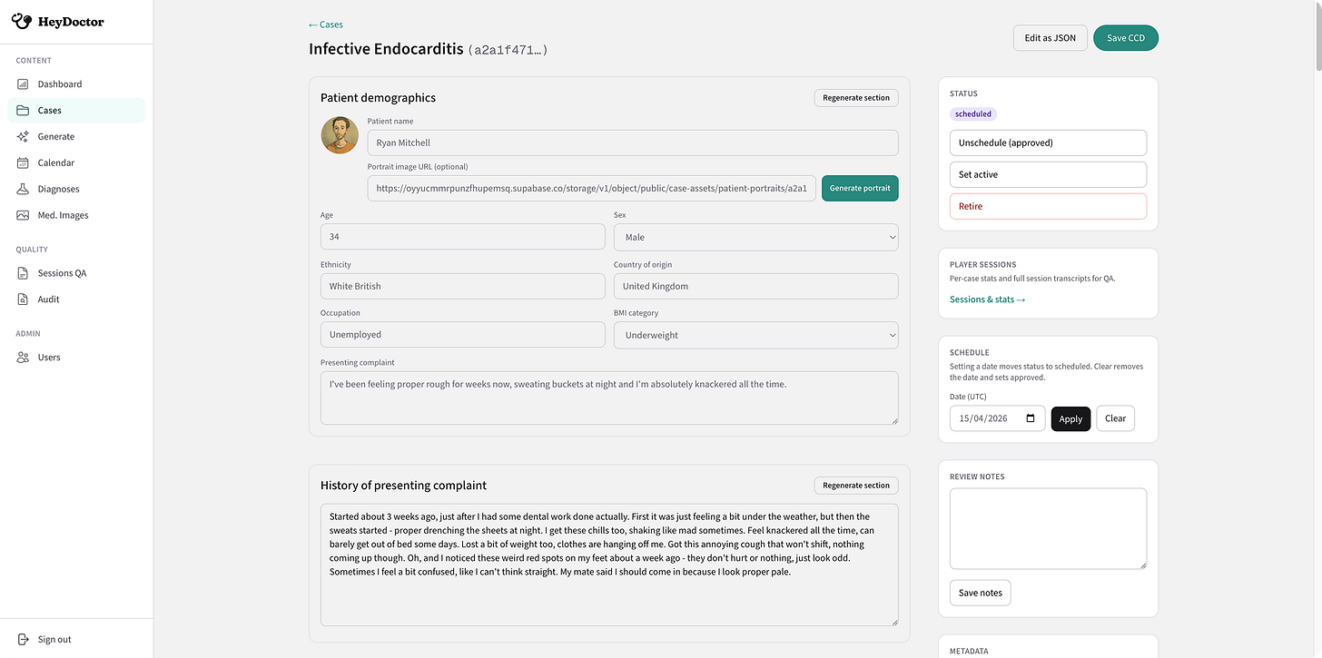 I built a full admin panel to manage the whole pipeline: case generation, diagnosis management, scheduling, session review. For building the library faster, there’s also a batch tool that can generate many cases at once from a checklist of diagnoses.
