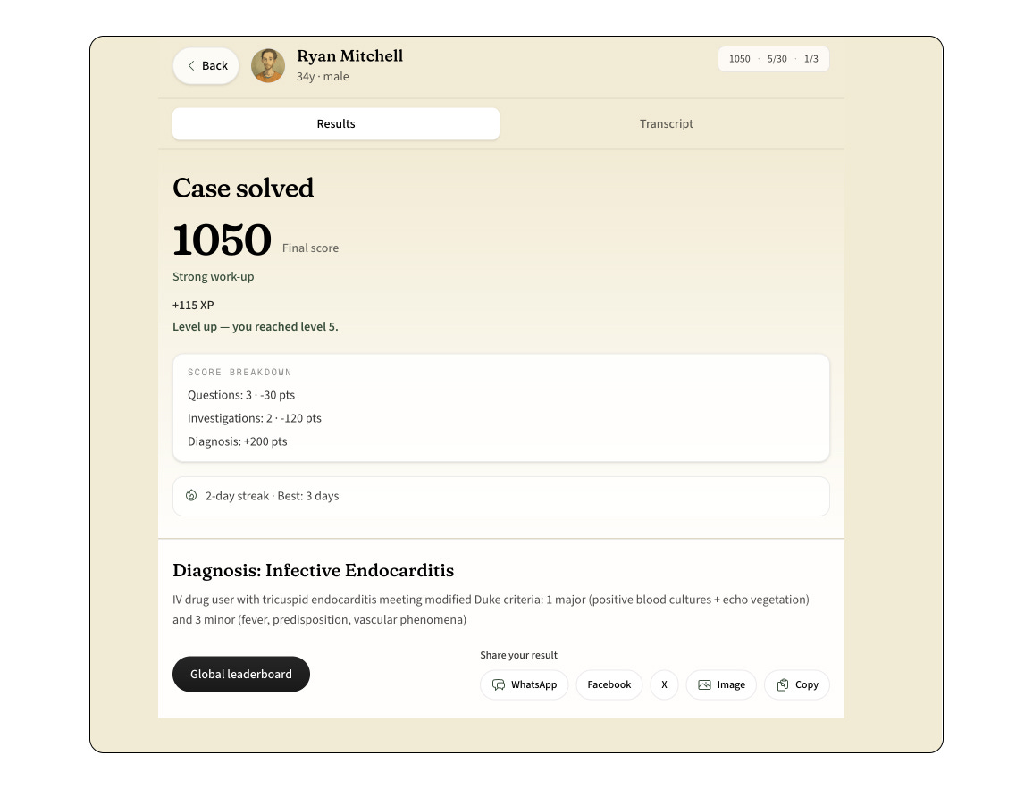 Not just using it. Competing. Comparing scores. Challenging each other to solve the case with fewer questions, fewer tests. The gamification layer I hadn’t built yet... they were already creating it themselves.