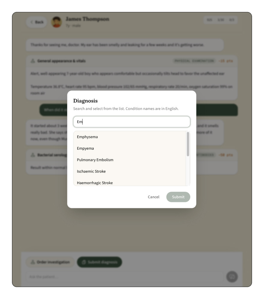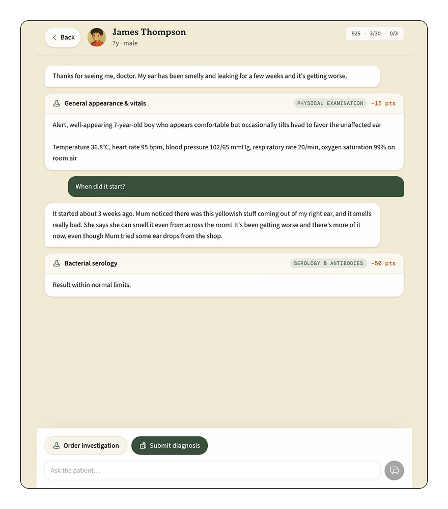 You start by talking to the patient. Ask questions in natural language. The AI responds in character, sharing symptoms, history, and concerns the way a real person would... gradually, sometimes imprecisely, always grounded in a pre-authored clinical case that ensures medical accuracy.