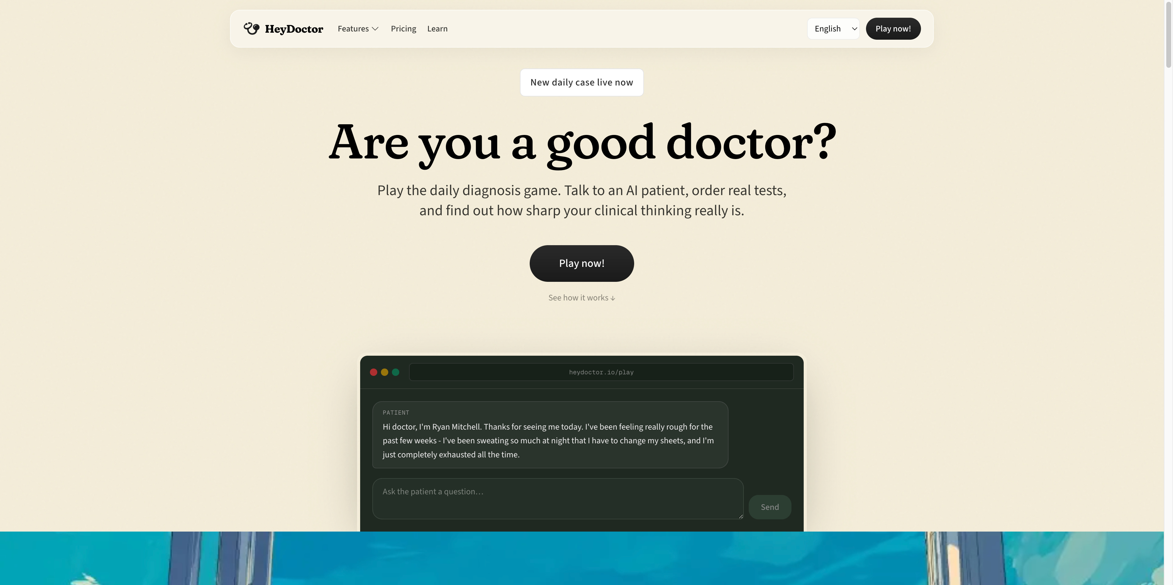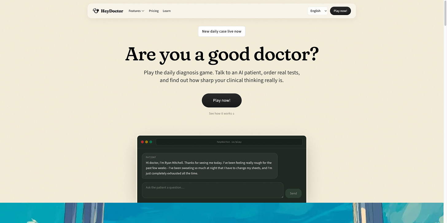 HeyDoctor is a daily clinical reasoning game. Every day at midnight UTC, a new case drops. You have 24 hours to solve it.