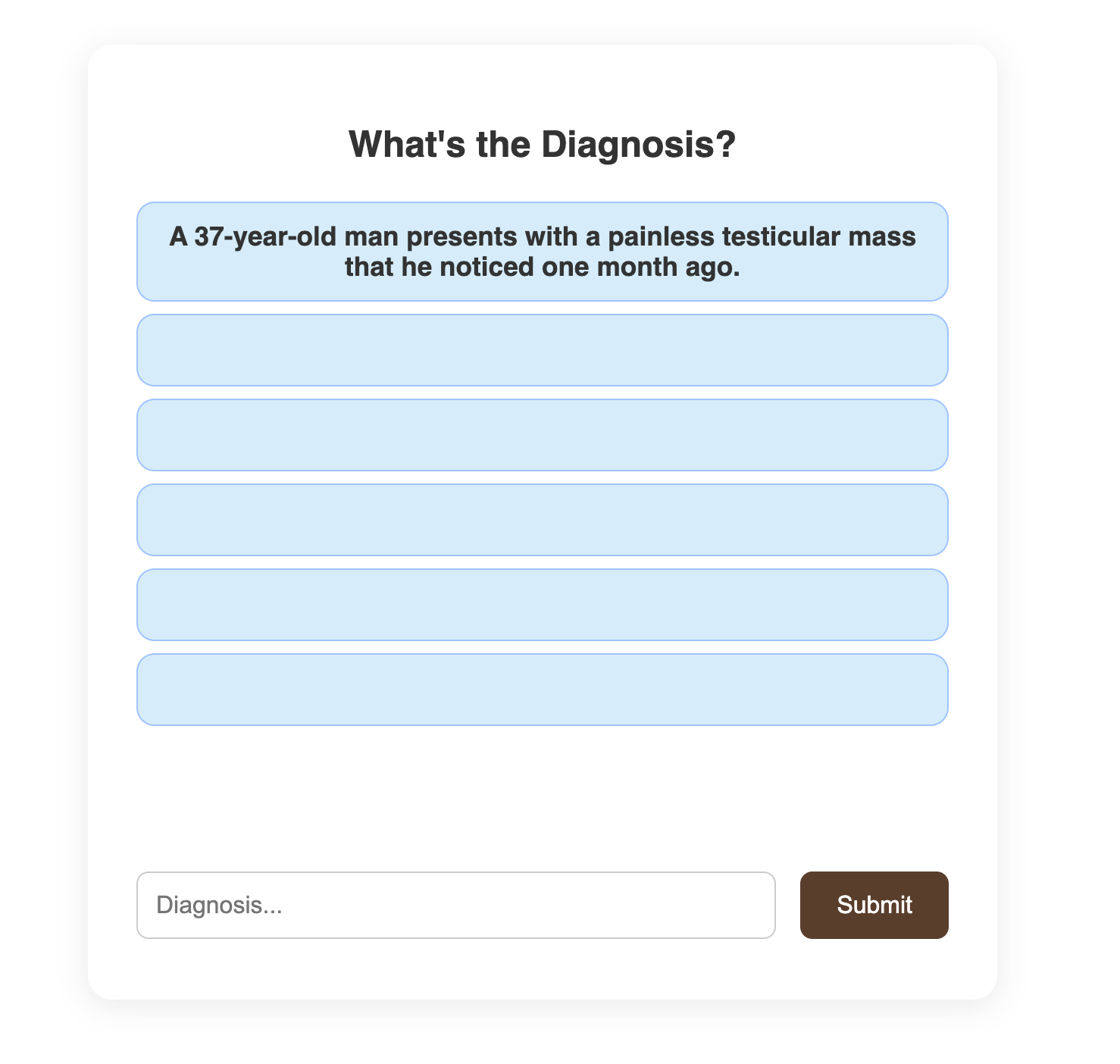 Then you submit your diagnosis. You get three attempts to pick the correct one from a curated database of over 1,100 conditions across 20 medical specialties.