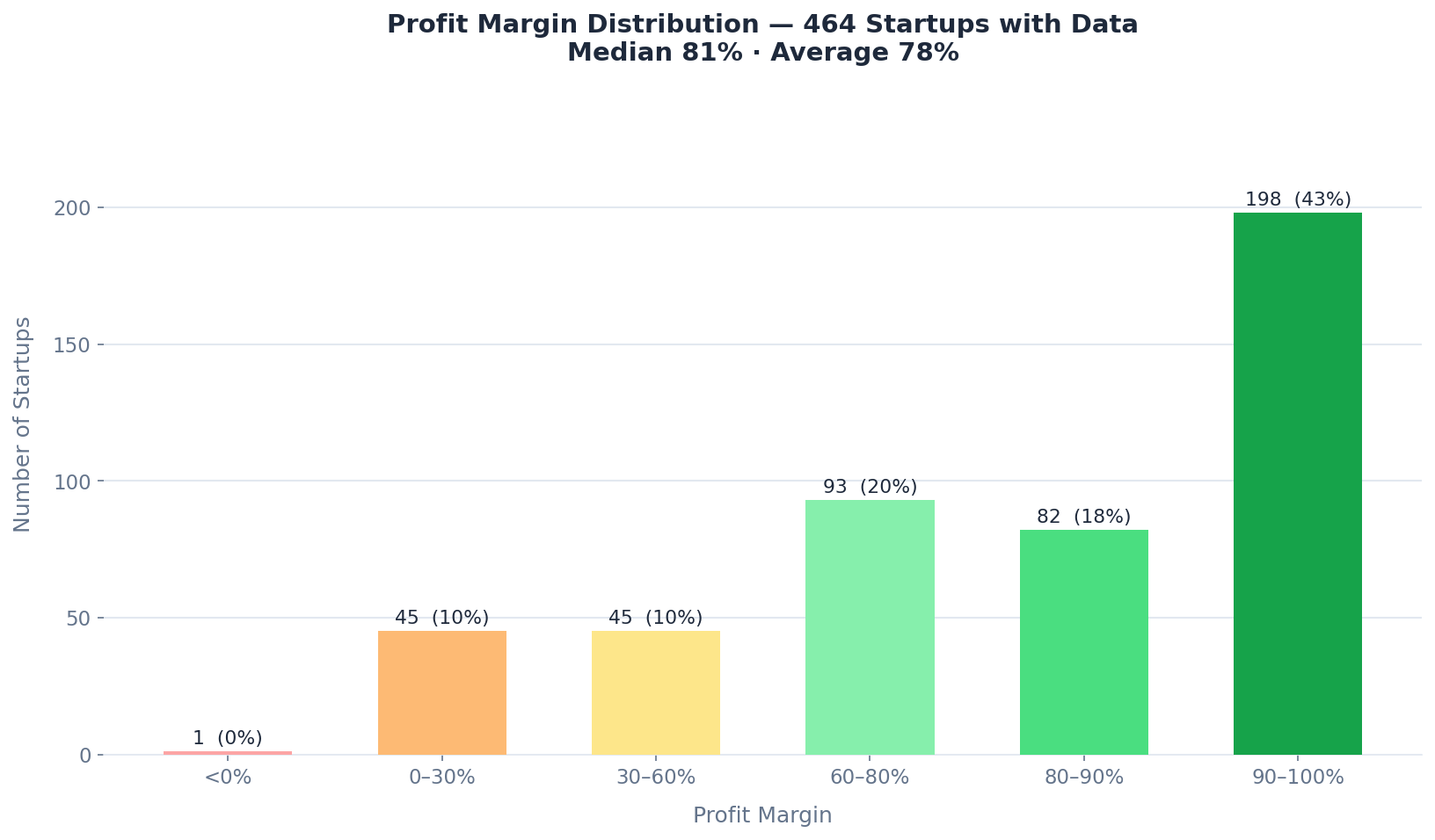 When I looked at profit margins, something shifted. Among the 464 startups that reported margin data, the median was 81%. The average was 78%. About 80% of them run at margins above 70%.