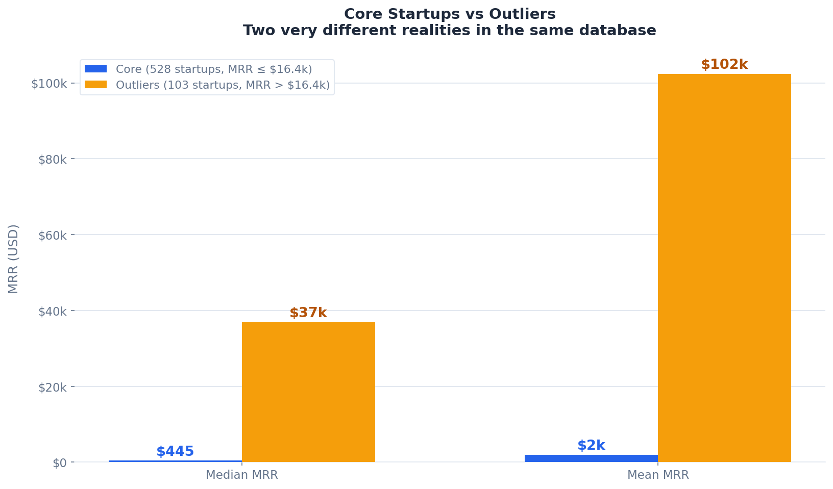 For the outliers, I used a standard statistical method (the IQR rule) to identify projects that sit far enough above the rest to be a genuinely different category of business. That threshold landed at roughly $16,400 MRR. Everything above it, 103 startups, I analyzed separately. Everything below, 528 projects with positive revenue, is the core dataset.
