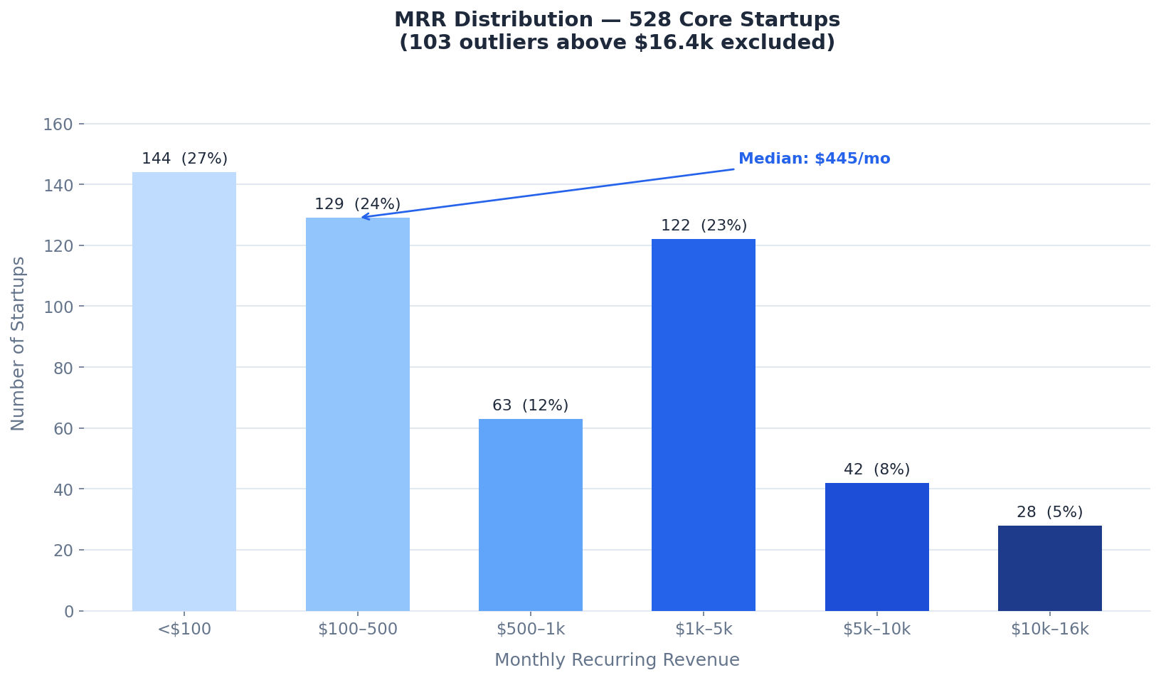 About 51% of the core projects are under $500 MRR. But once you zoom into the $1,000 to $5,000 band, something shifts. There are 122 startups there, a real cluster.